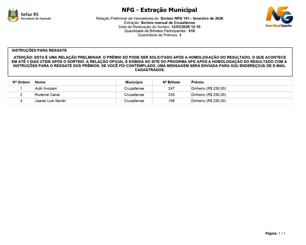 GANHADORES DA NOTA FISCAL GAÚCHA DO MÊS DE FEVEREIRO DE 2026 – MUNICÍPIO DE CRUZALTENSE/RS- SORTEIO NFG 161